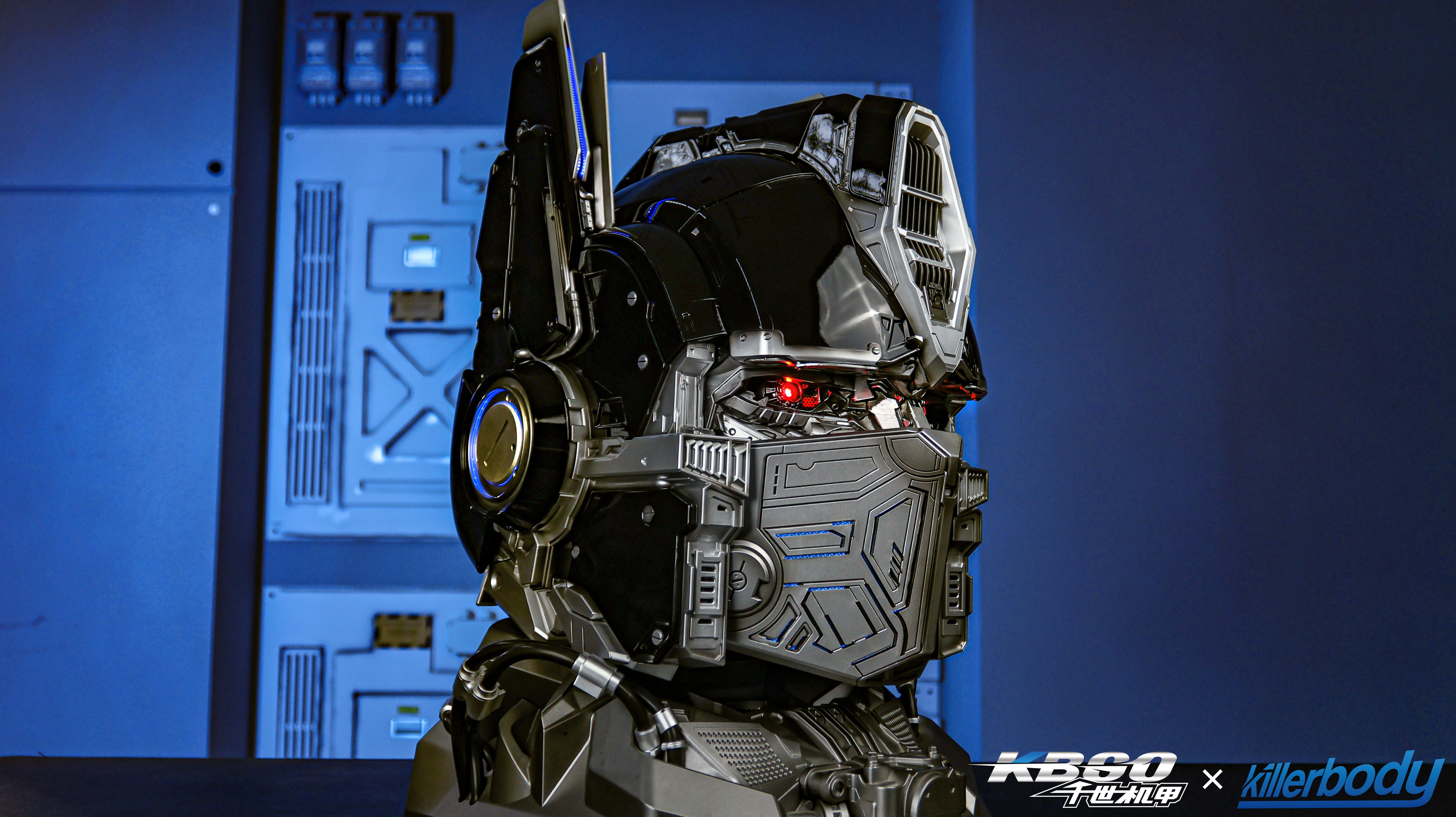 2.Movable mask has mechanical texture and is embedded red and blue lights, mask moves and lights up when speaking with sound effects;